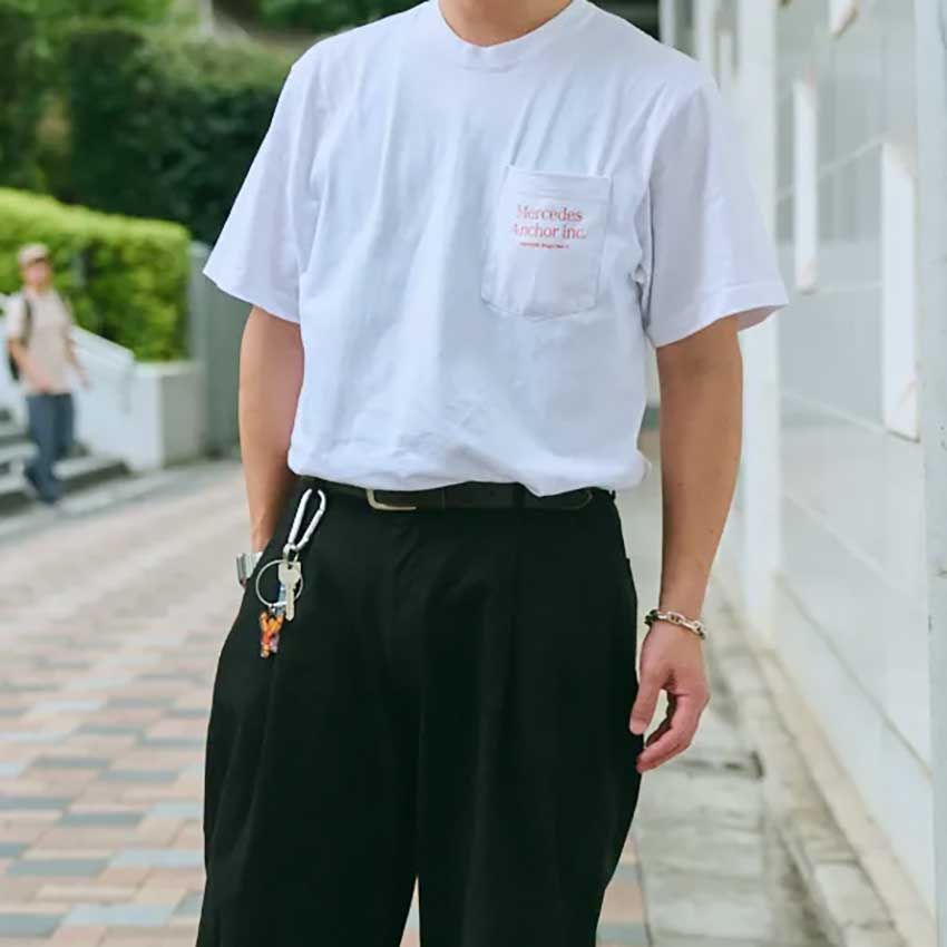 ▶高田さんのスナップをすべて見る高田涼平さん(25歳)同じくタックインを駆使した白T&黒スラックスの着こなしながら、サイズ感が変われば印象は激変。ジャスト寄りなら当然、いっそうシュッとして見える。