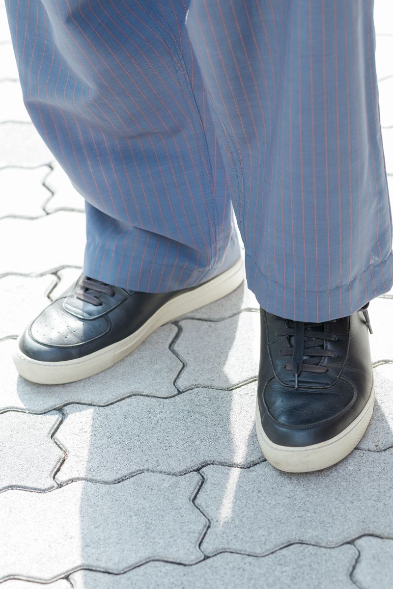 ▶中立さんのスナップをすべて見る中立 遼さん(39歳)“ギャルソン”で揃えたシャツ&超ワイドパンツで、色も幅も異なるストライプ同士を掛け合わせ。ユニークな柄×柄を、モードな力業で有無をいわせずこなしてみせた。