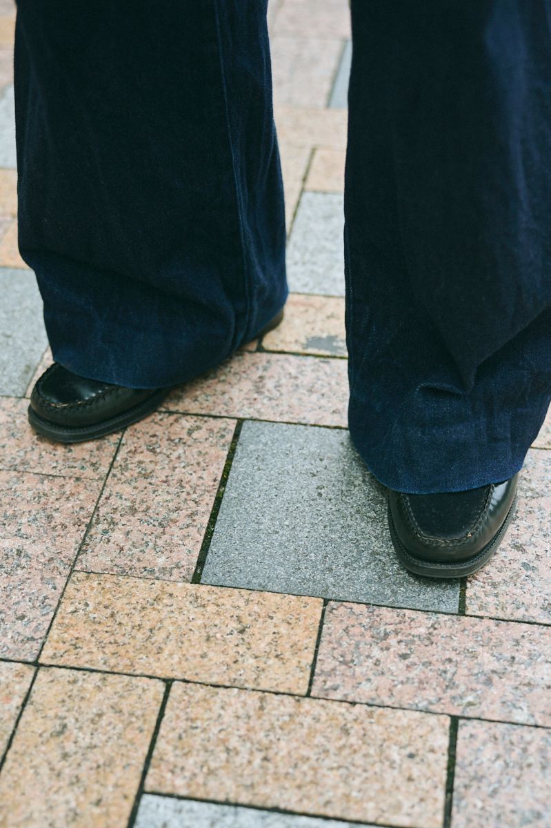カットソー=マリオンヴィンテージ パンツ=古着 シューズ=ボッテガヴェネタ 眼鏡=ジンズ ベルト=コムデギャルソン 靴下=靴下屋 リング=トムウッド リング2=シハラ