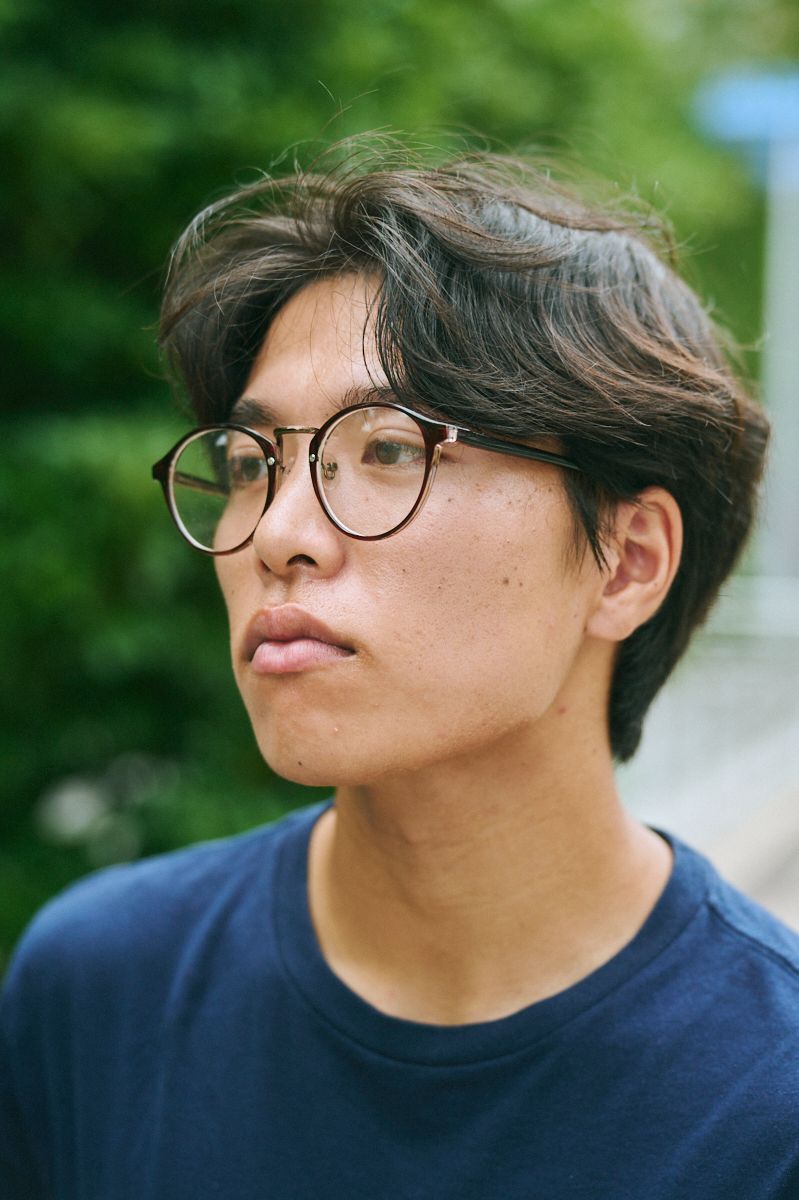 Tシャツ=ギャップ デニム=ユニクロ シューズ=ジーエイチバス 眼鏡=古着 ベルト=リーバイス
