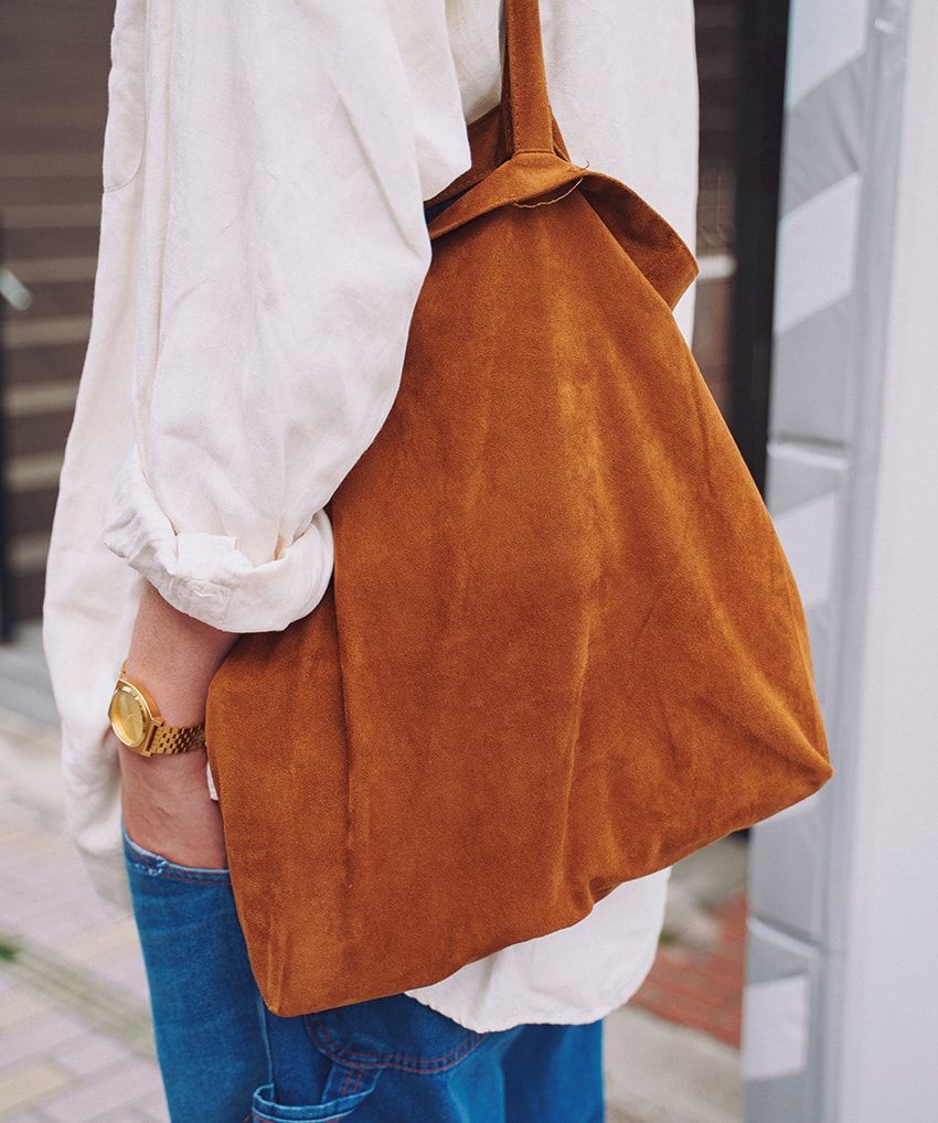 ただし、その定番力にあぐらをかかず、スエードバッグや金時計でしっかり個性を添える。裾も袖もロールアップして抜け感も演出。