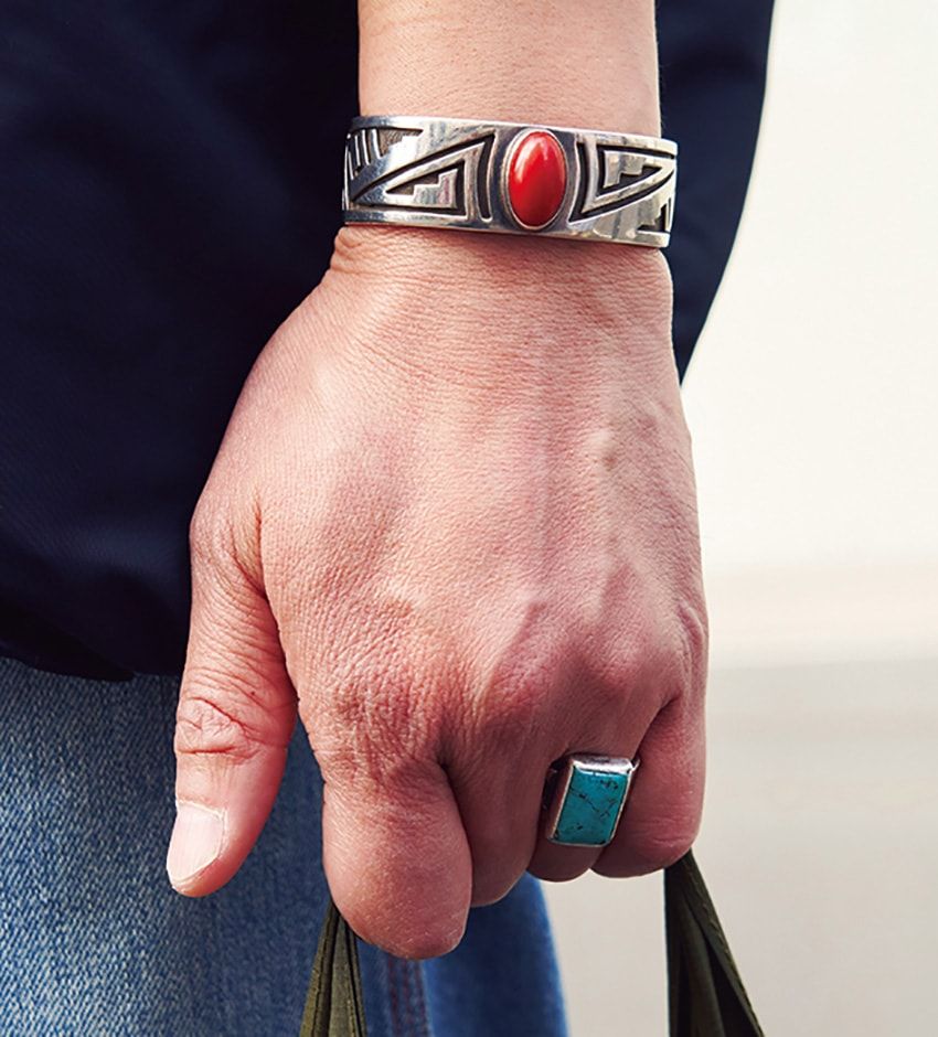 さらには、武骨なアクセサリーを手元と首元にさらっと組み込む。自分の“好物”を取り入れた等身大の装いで、余裕たっぷりの休日コーデに。