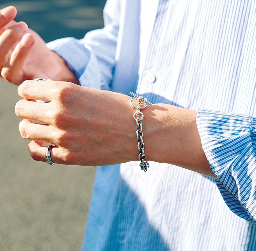 デニム=古着 シャツ=エディフィス サンダル=ウーフォス メガネ=レスカ ルネティエ ブレスレット=不明