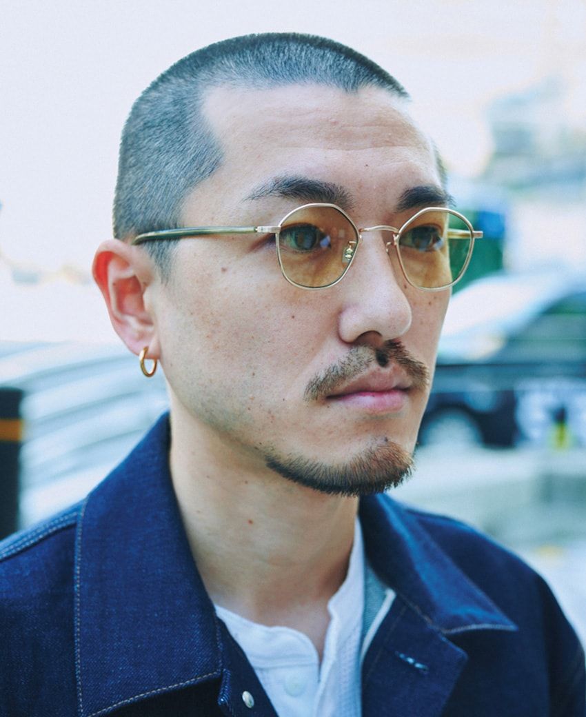 デニムジャケット、デニム=タナカ カットソー=ユニクロ 靴=フットインダストリー メガネ=不明
