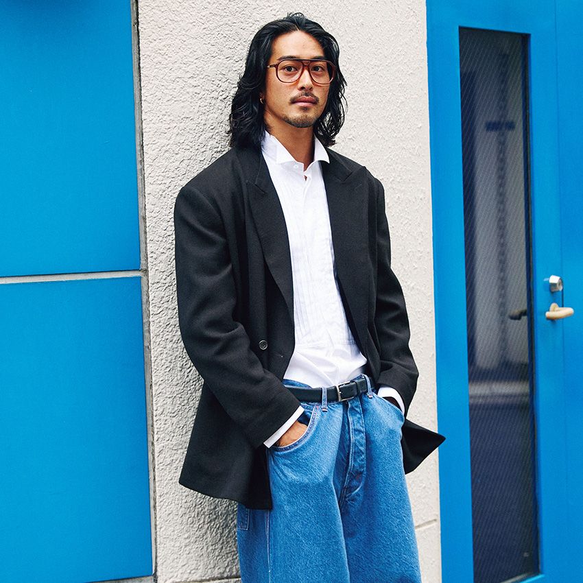 デニム4万2900円/グランク、ヴィンテージのメガネ2万7500円/ともににしのや 03-6434-0983、ジャケット12万1000円/ワングラビティ、シャツ4万4000円、ベルト1万6500円/ともにエストネーション(すべてエストネーション 0120-503-971)、スニーカー1万5950円/アディダス オリジナルス(アディダス 03-6732-5461)