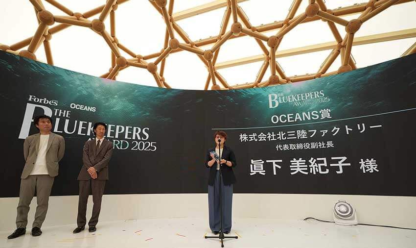 表彰台に立った同社の杉山 公寿さんは、「皆さんが例えばふるさと納税などで魚を受け取るとき、『あ、これは環境に配慮されたパッケージだな』と言ってもらえる日が来たらうれしいです」と心境を語った。