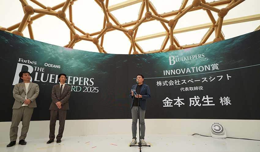 INNOVATION賞は、人工衛星とAIを組み合わせて海を上空から監視するスペースシフトが受賞。オイル流出、赤潮、藻場消失といった海洋の変化を地球規模でリアルタイムに検知し、実用的なソリューションを提供する点が高く評価された。
