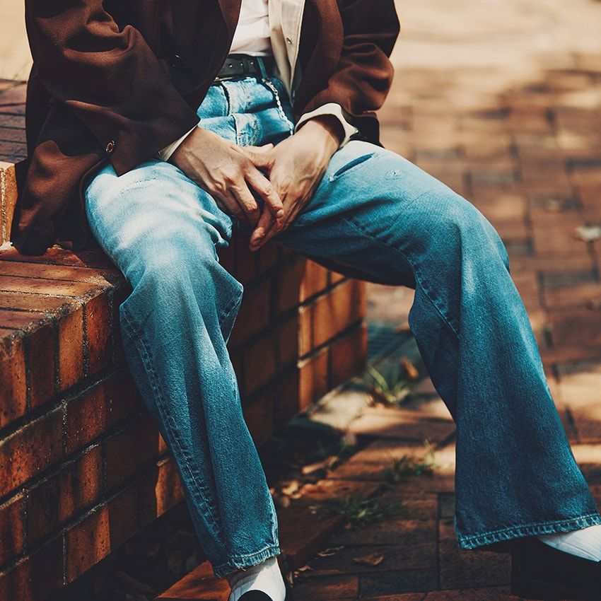 「マーティーアンドサンズ」いい意味で細部にクセがあるデニムだ。わずかにフレアしたライン。独特のヌメッとした質感。腿に少しだけ入れたリペア加工。このデニムを活かすコーディネイトとして、テーラードジャケットとの合わせを提案したい。