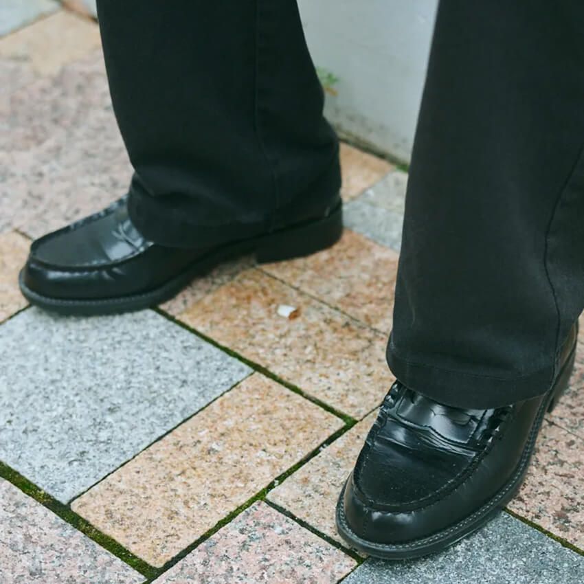 ▶︎永治さんのスナップをすべて見る永治悠翔さん(23歳)お次は古着シャツが洒落た永治さんの足元をパパラッチ。どこか懐かしさも漂う柄シャツには、大人ボトムスの定番、ディッキーズの黒をコーディネイト。ベルトマークしてタックインスタイルで見せることで、キレイめな印象も添えた。ローファーは王道中の王道、ハルタを選び、カジュアルな中にも品の良さを演出。パンツと靴のバランスもGOODです!
