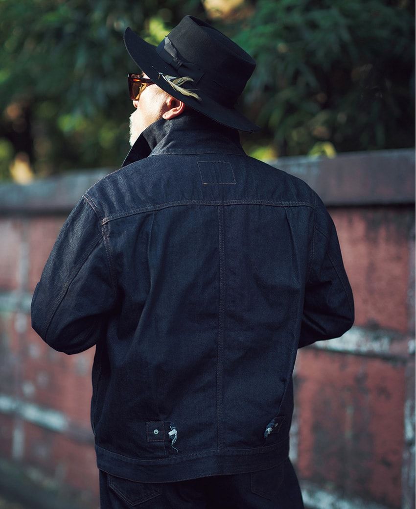 13.5オンスのワンオッシュデニムで仕上げた「TOKYO」。適度に肩が落ちたリラックス感の漂うGジャンと、ビッグシルエットのストレートパンツは今の気分にピッタリ。首元で存在感を放つネイティブアメリカンジュエリーで個性を加えるのが熊谷流だ。ちなみに各アイテムには、スペシャルボックスが付属する。デニムジャケット4万9000円、デニム3万9000円/ともにGDC、ハット4万2900円/GDC × ボナ・カペロ(すべてGDC 代官山 080-4153-2623)。靴=オールデン サングラス=ラピマ ネックレス=ナジャ
