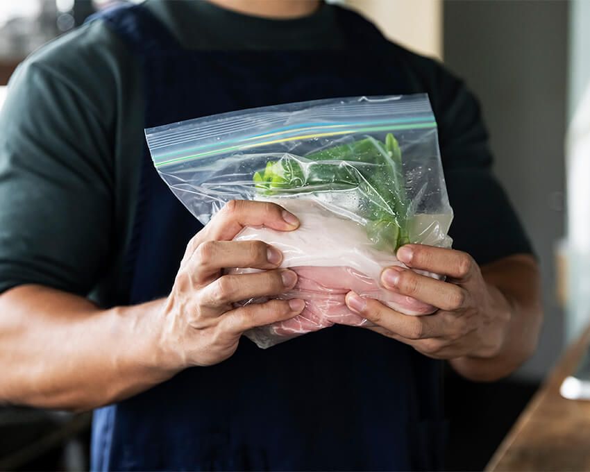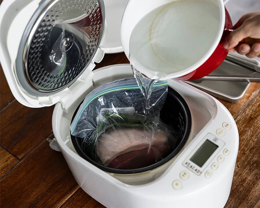 塊肉のまま調理する場合は、保存袋ごと炊飯器に入れて、沸いた湯をたっぷり注ぐ。保温機能を使い、2時間〜2時間30分、じっくりと加熱する。
