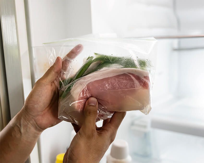 ①熱に強い保存袋にアメリカンポークとすべての調味料を入れてよく揉み込む。塊肉のままでも、厚みが半分になるように二分割してもOK。