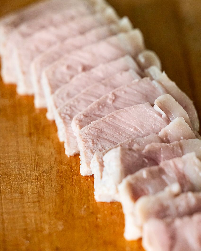 ブライン液に含まれる塩によってポークのタンパク質が分解されて水分が入るうえ、砂糖の浸水性によって水分を逃さずキープ。しっとりジューシィに仕上がる。