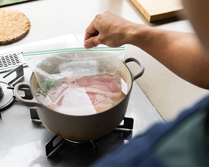 肉を二分割している場合は、お湯1ℓを沸かした鍋の鍋底に耐熱皿などを敷き、保存袋のまま鍋に入れる。そのまま極弱火で15分、その後火を消して裏返し、10分ほど休ませる。