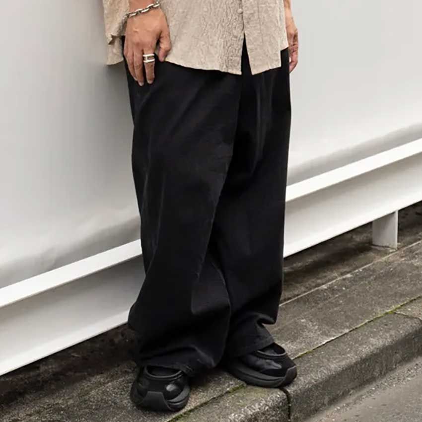 スペイン発のラグジュアリーブランド、バレンシアガの“らしさ“を感じさせる極太のブラックデニム。かなりルーズではあるが、スニーカーも黒を選んで色を統一&引き締め。まったくだらしなく見えない。