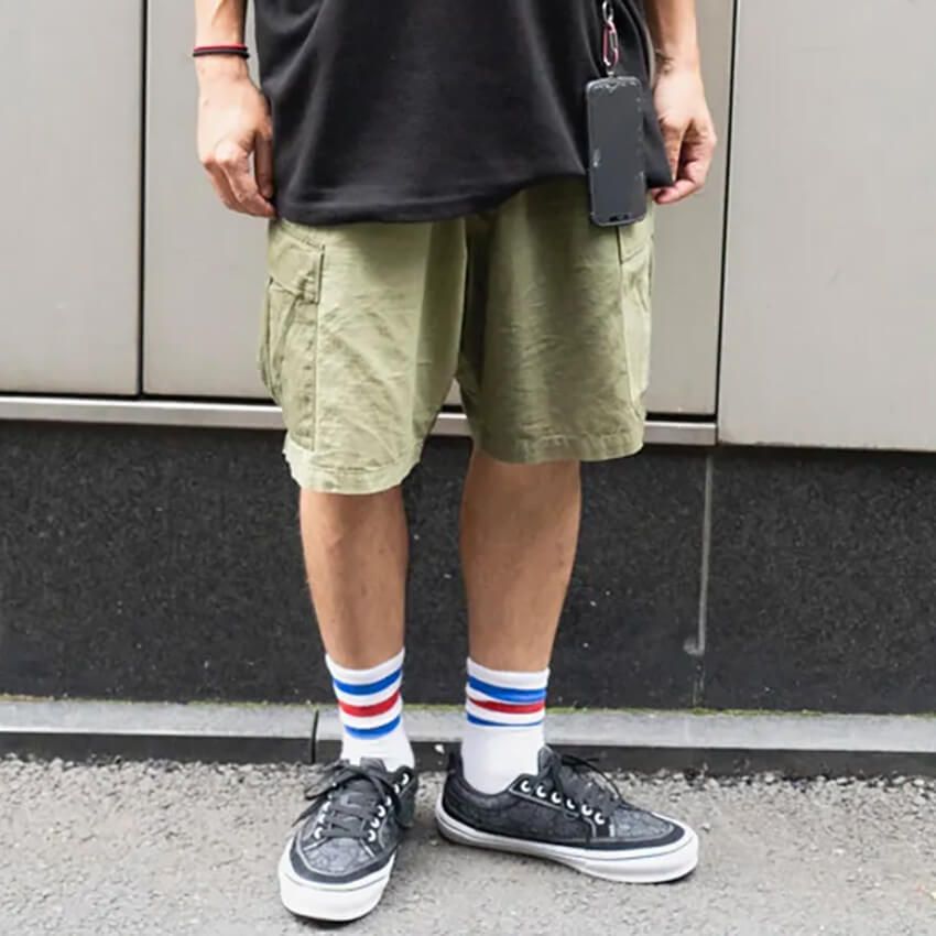 ▶︎最上さんのスナップをすべて見る最上夢人さん (43歳)Tシャツとスケシューを黒で揃え、ショーツのカーキカラーをアクセントに据える。大人っぽさを意識した、初秋のアクティブスタイルだ。