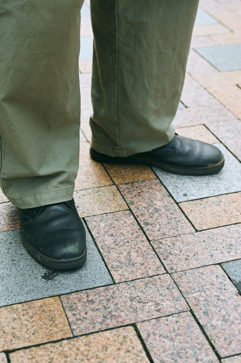 ▶︎河村さんのスナップをすべて見る河村 航さん(55歳)ミリタリー系の古着ファティーグパンツを、ジャストなサイズ選びで上品にこなす。純白のポケTだってタイト寄り。同じく白いスニーカーとともに、装いを誠実に映す。