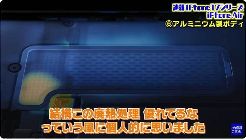iPhone 17 Proには、ベイパーチャンバーというプレートが入っているため、排熱しやすい特徴があります。また、従来の素材に使われていたチタニウムではなく、アルミニウムの素材が使用されています。