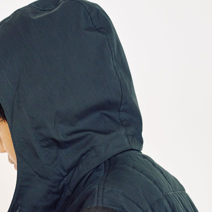 着脱可能なフード付きで、外せばスタンドカラーとしても着用可能。まったく印象が異なるので、その日のコーデや気候に合わせて選ぶのも楽しい。