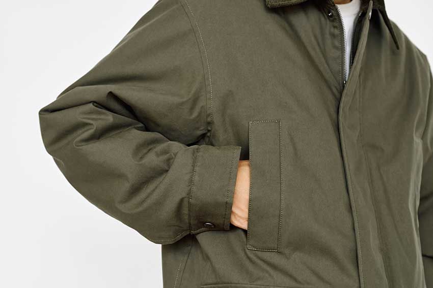 撥水加工がなされたコットンナイロン素材は、ハリのある素材感。着込んでいくうちに出てくる風合いが楽しみでもある。前面の右ポケットの裏地は、起毛トリコットが用いられており、ハンドウォーマー代わりにも持ってこいだ。