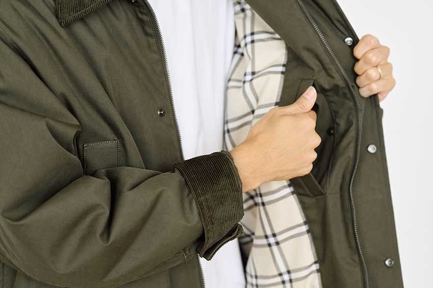 内側にもポケットを配置。裏地のチェックと襟とカフスにあしらわれたコーデュロイ素材がブリティッシュな雰囲気を香らせる。