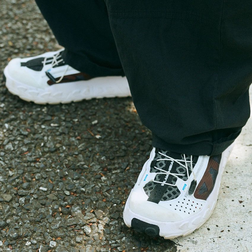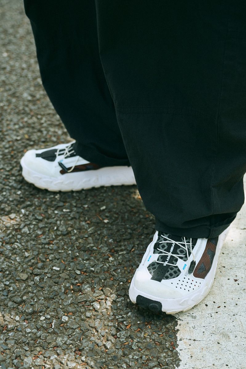 続いては浅田さんの愛用モデルをチェック! コム デ ギャルソンのグレーTシャツにマーカウェアの黒パンツというワンツーコーデのワンポイントにサロモンを投入。水辺や陸上のあらゆるアウトドアで活躍するハイブリッドシューズ「Solamphibian」は、機能の素晴らしさだけでなくビジュアルもかなり良い。厚めの白ソールがダークトーンの着こなしによく映える。