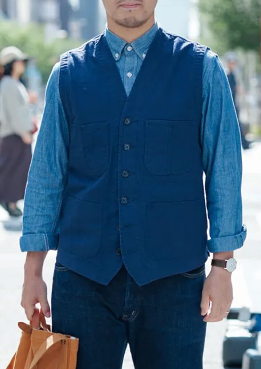▶︎山竹さんのスナップをすべて見る山竹矢晃さん(36歳)デニム地のキャスケットとシャンブレーシャツ、ジャストサイズのインディゴデニム。クラシカルなブルーの三重奏に、青いワークベストでダメ押し。全身から個性が迸る。