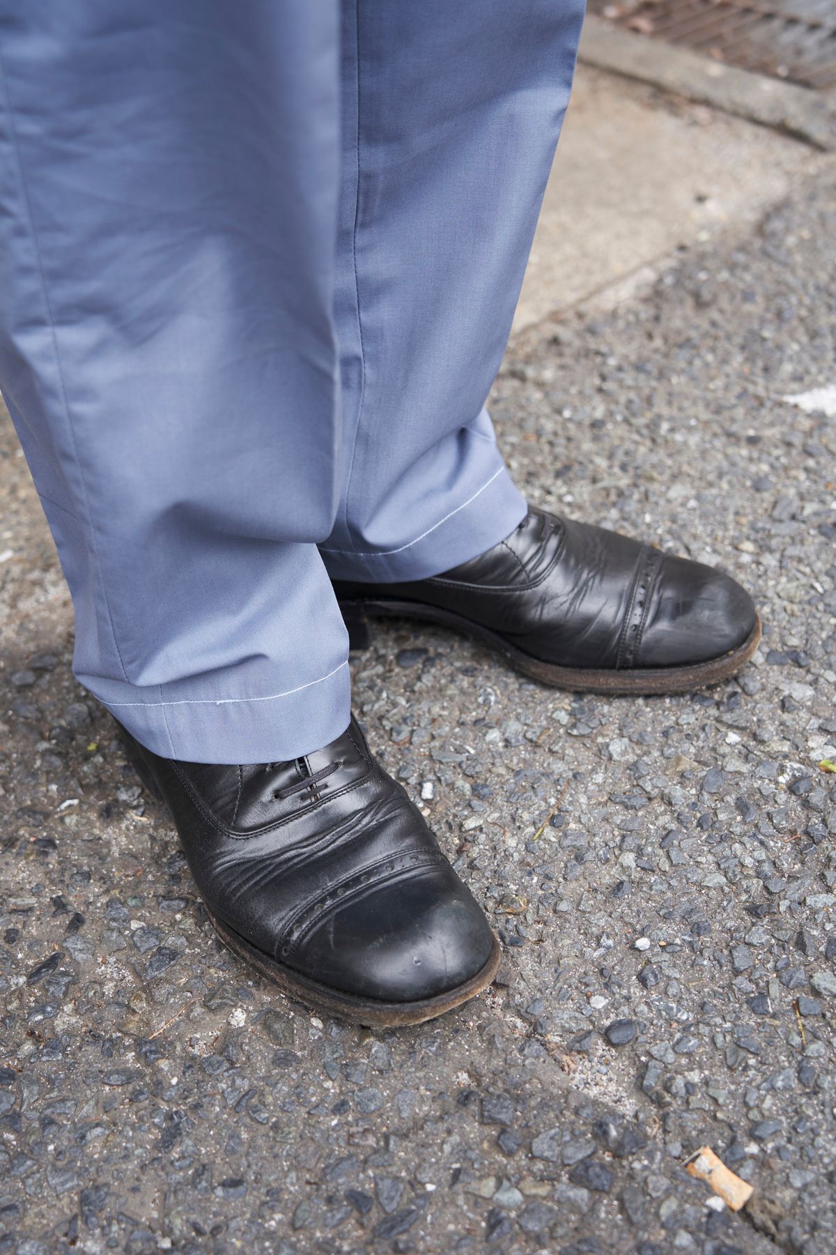 パンツはタック入りのブラックを選んで、程よくワイドなシルエットを強調した。ローアーを含むトータルコーディネイトで漂う、あえての“制服感”。ユーモアもあって、洒落てる。