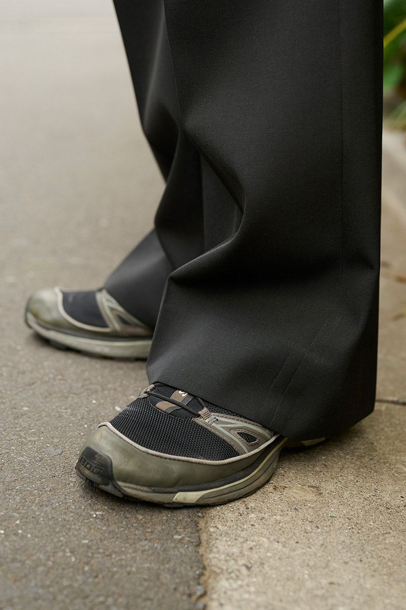 インナーに白ベースの白Tシャツを仕込み、黒いワイドスラックスをコーディネイト。サロモンのテック系スニーカーで今っぽさも添えている。