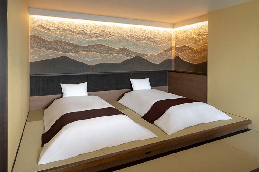 ほかにも、照明には薩摩和紙を使用し、花瓶には金銀に次いで価値の高い金属・錫で作られた薩摩錫器、日本三大織物のひとつである大島紬が壁飾りに使用されるなど、景色だけでなく日本の伝統美の設えもまたご当地部屋の魅力である。