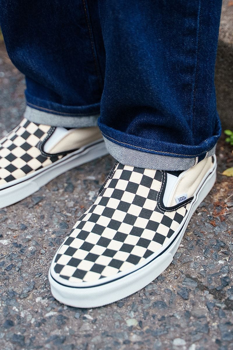 白Tを挟むことで軽さを出し、チェッカーボードのヴァンズで遊び心を添える。クラシックなアイテムを今の空気感で着こなす好例だ。
