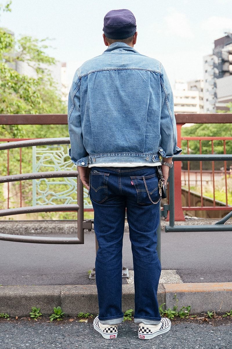 森口さんのスナップをすべて見る森口徳昭さん(46歳)ヴィンテージライクな色落ちした短丈ジャケットに、同じくリーバイスの色落ちデニムを合わせたコンビネーション。中にプリントTを仕込み、ラフな雰囲気を演出。