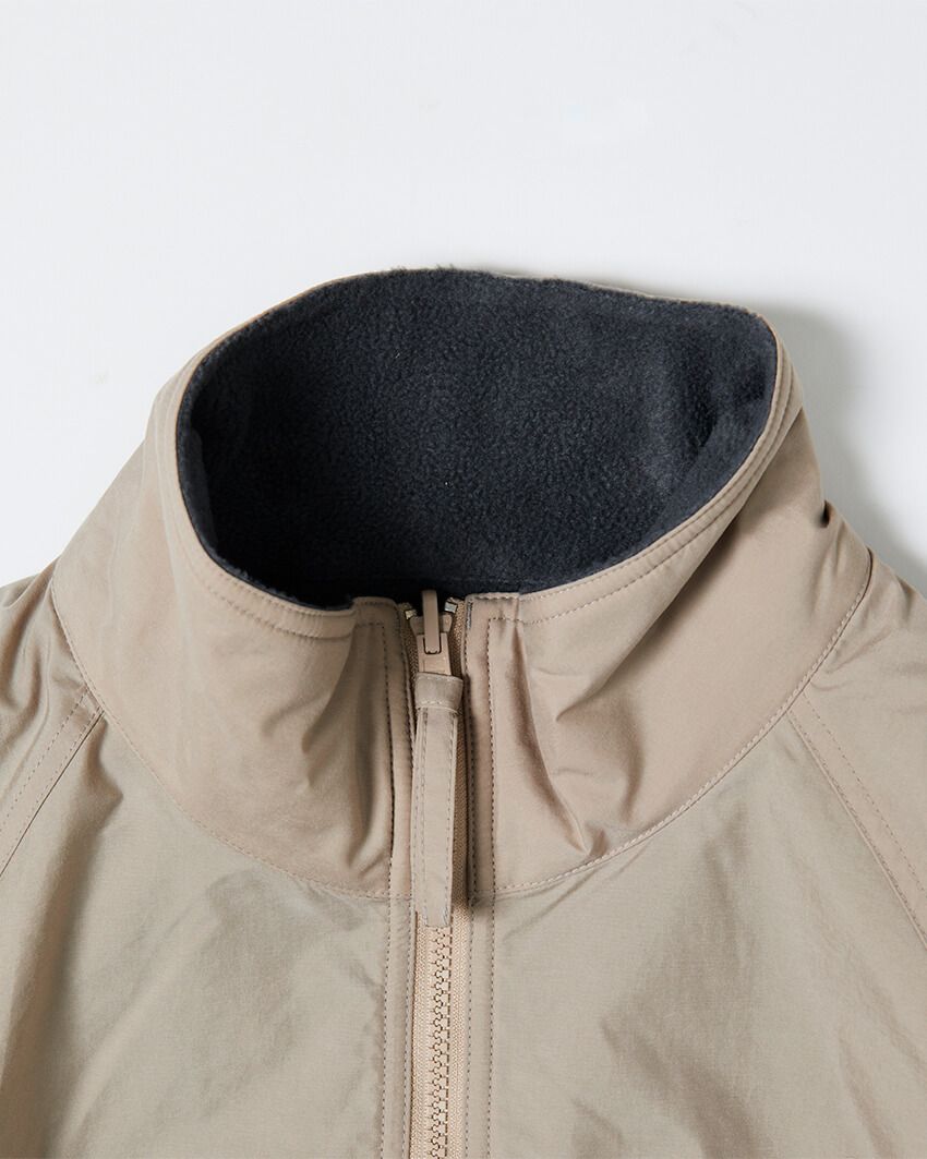 まず注目したいのが襟元。フリース面を表にした際には、ナイロン面が襟裏に見え隠れし、さりげないコントラストがスタイリングのアクセントに。逆にナイロン面を表にすれば、フリース面が顔まわりを温かく包み込む。どちらを選んでも機能性とデザイン性を両立している。