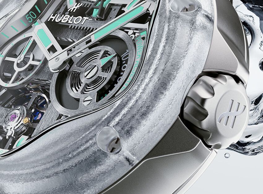 ディテールを見ていこう。水しぶきをイメージしたサファイアクリスタルのベゼルには、ウブロ初の試みとして「フロスト加工」を施す。これは「FROST=霜・氷結」のとおり、素材の表面に砂を吹きつけ研磨。すりガラスのような質感に仕上げる加工技術を指す。