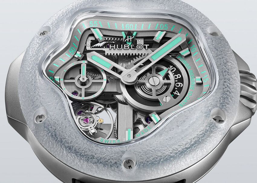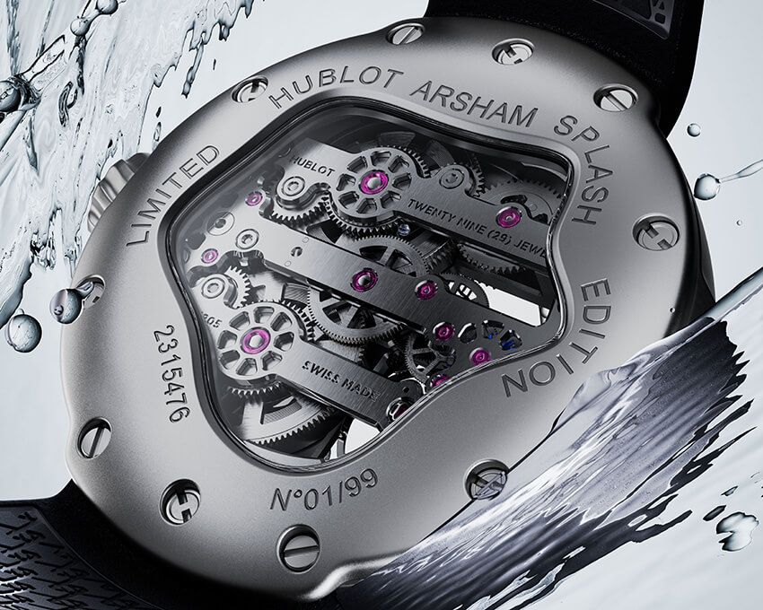 この時計をプロデュースしたのは、アメリカ人アーティストであり、ウブロのアンバサダーを務めるダニエル・アーシャム氏。“水”の流動的なフォルムや透明性を時計で表現した。