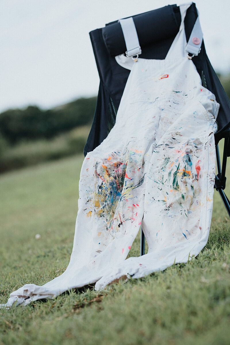 ――普段着られている、白いツナギにもペイントの跡が垣間見えます。岳 古着で買った「ディッキーズ」の白い作業着なんですけど、描き続けていくうちに絵の具の跡がどんどん増えて。そのサマが今の自分を刻んでくれてる感じがして、気に入ってるんですよ。汚れ=進化、みたいな感覚かな。