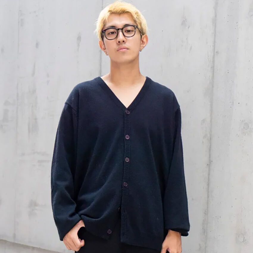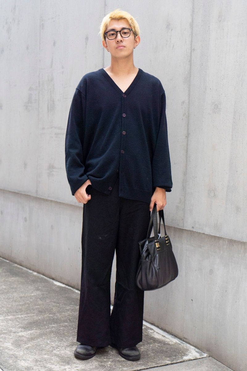 ▶︎山形さんのスナップをすべて見る山形一生さん(22歳)上下ともに古着を用いて、ダークトーンのネイビー&ブラックでまとめる。シック、でもマイルド。ややゆったりめのカーディガンが、程良いリラックス感を放出する。