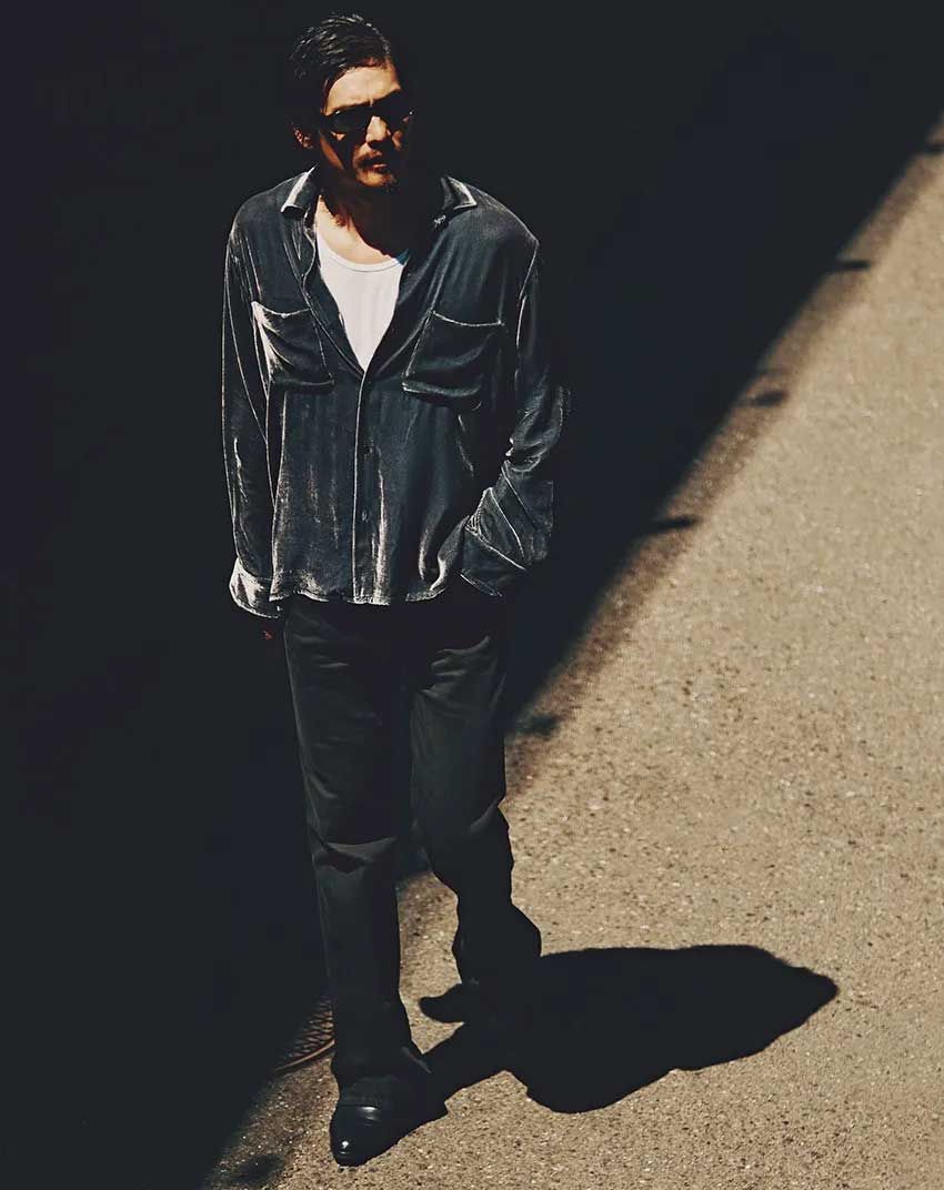合わせるのは、見る角度によって表情が変化するベルベット生地のシャツだ。インナーには上質な素材のタンクトップを重ねている。シンプルながら、剣星さんらしい大人の色気が漂うコーディネイトに。
