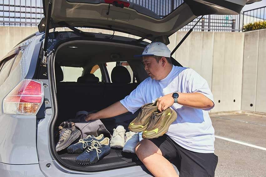 赤羽さんといえば大のスニーカー好きとしても知られる。この日、見せてくれたのはトランクに積んだ7足のmy favorites。