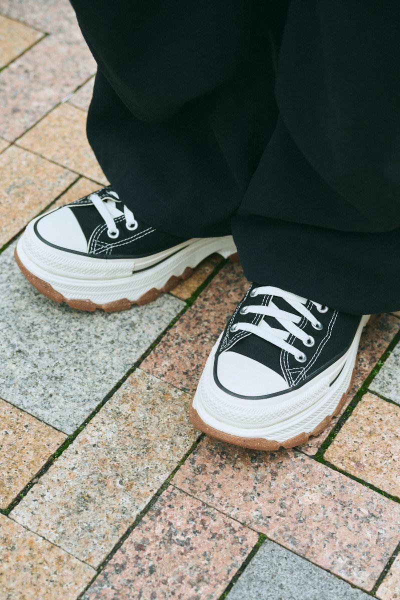 スニーカーも普通のオールスターかと思いきや、トレッキング仕様の厚底を装備した「トレックウエーブ OX」を大抜擢。全身クセあり、センスアリのグッドサンプル!