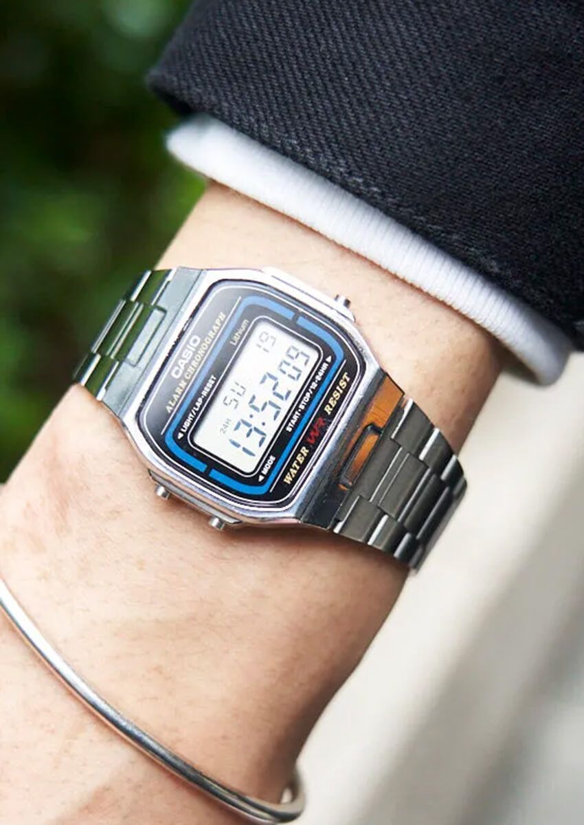 腕元にはカジュアルコーデに馴染む「A158WA-1JH」。ベーシックでありながら、ハズしにも使える。近年人気が再熱している時計だ。