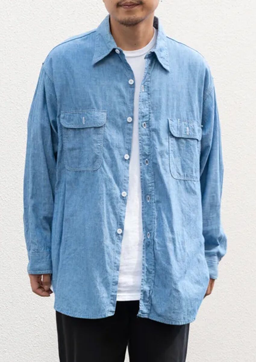▶︎宮城さんのスナップをすべて見る宮城真一さん(32歳)まずは、老舗ワークブランド「ビッグマック」のタフなシャンブレーシャツから。あえてボタンはラフに留めて、ゆったりとしたボックスシルエットを存分に味わう。