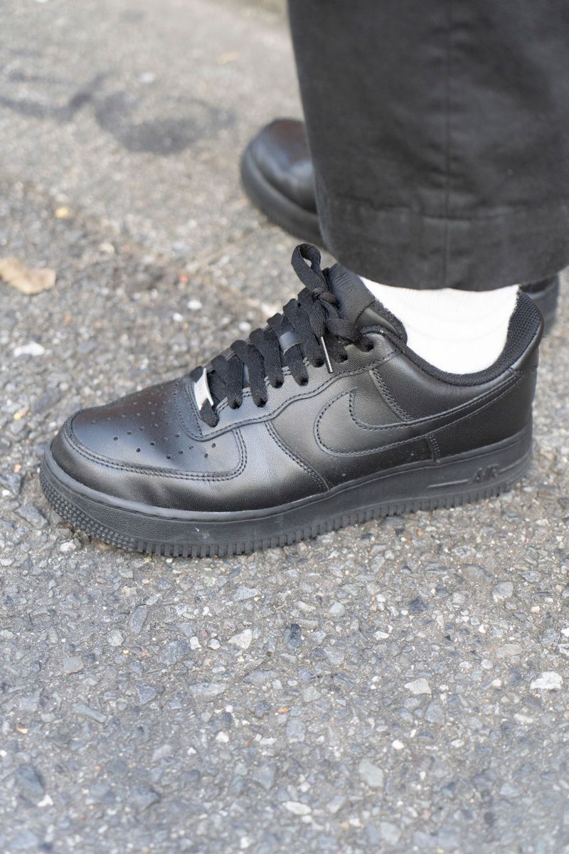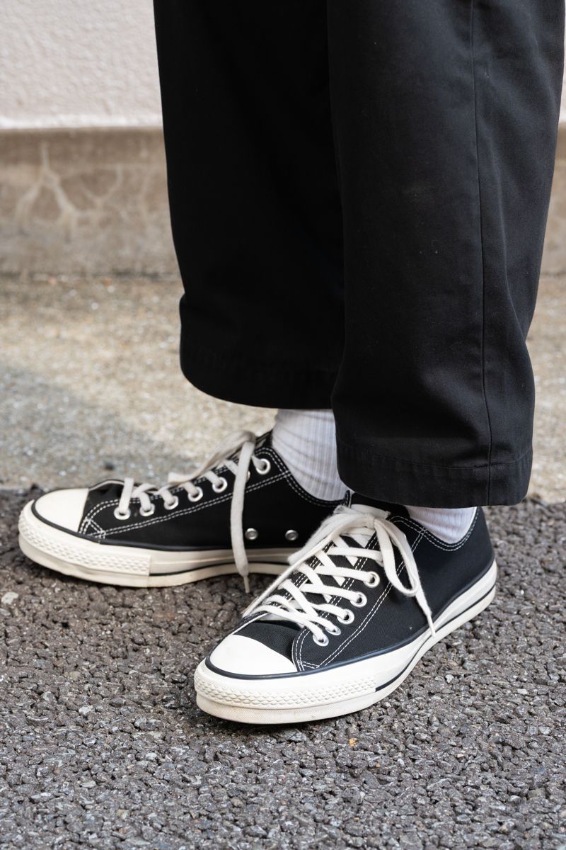 パンツはタイトめを意識することで、上下のシルエットにメリハリを創出。インナーとソックスは白で合わせてヌケを出すなど、細かいテクニックもシンプルゆえに際立ってくる。