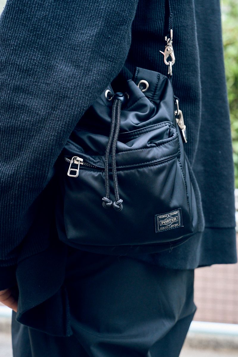 カーディガン=不明 Tシャツ=ハーパーズバザー パンツ=ノーブランド シューズ=プーマ バッグ=ポーター