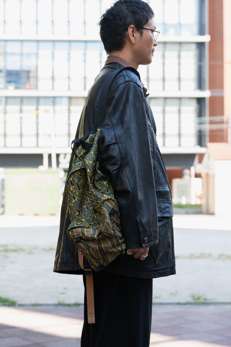 対するインナーとパンツの合わせは無難にシュッと、と見せかけて“つなぎ”にグラフィックTをタックインするという徹底ぶり。バッグもアイウェアもナイスなクセ者である。