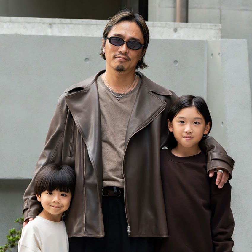 シメに選んだフワモコ系のシューズだって、レザースタイルを優しく仕上げる重要案件に。お子さんたちそれぞれのモノトーンスタイルもハマった、絵になり過ぎる家族の肖像だ。