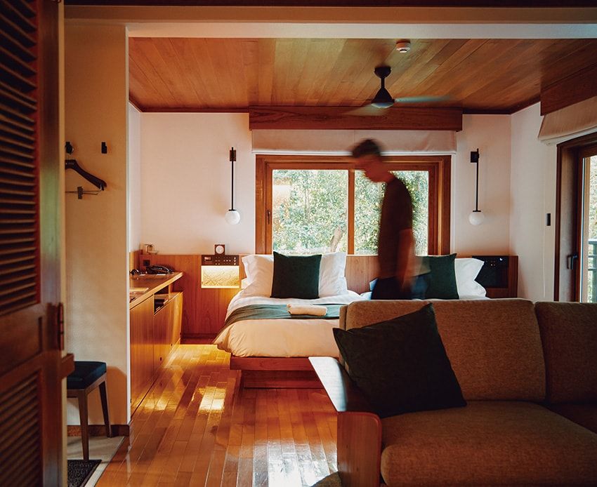 53㎡という程良い広さの客室は天然素材をふんだんに使用することで外との調和を図り、自然と一体化したような滞在を提供。しかも寝湯が用意された24時間ろ過循環型バスルームほか館内の水はすべて、汲み上げた地下水だ。