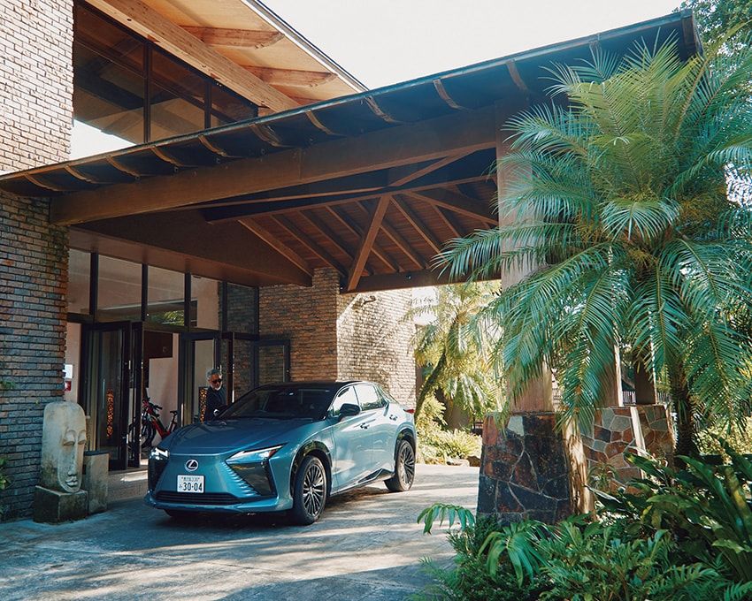 冒険のプランは専属ガイドにカスタムしてもらい、一生に一度の体験を。拠点のホテル&スパ「サンカラ」からレクサスの電気自動車「RZ450e」に乗り込み、いざ出発!