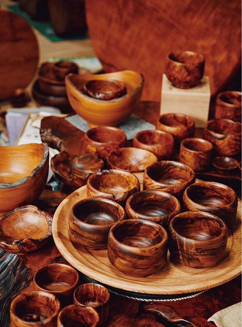 「原木の声を聞いて導かれるように削るんです」と創られる作品は、よく見る“テカテカの屋久杉土産”とは一線を画す。「あれじゃ屋久杉が泣いてるよ」と、上塗りは独自素材で最小限に。