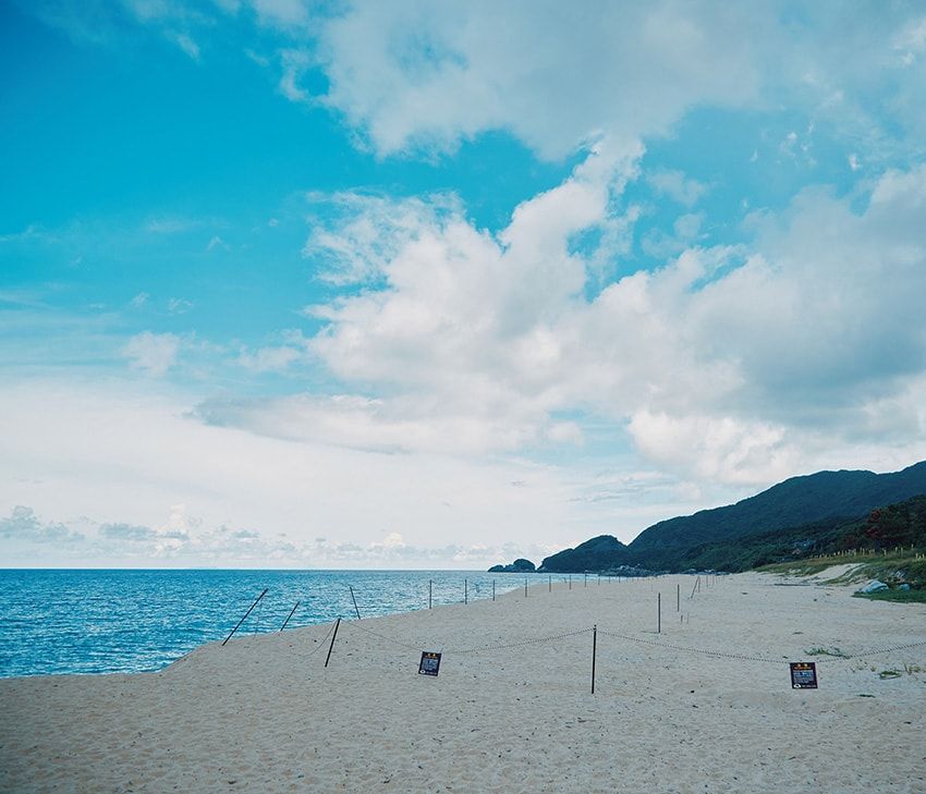 約1kmにわたる白砂のビーチで、日本一のアカウミガメの産卵地。彼らを驚かせないよう夜間は立ち入り禁止だ。